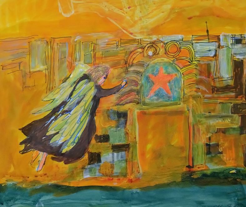 Ruuth Iiris, Rauhan lähettiläs, muste ja akryyli paperille, 40×47 cm, 2024