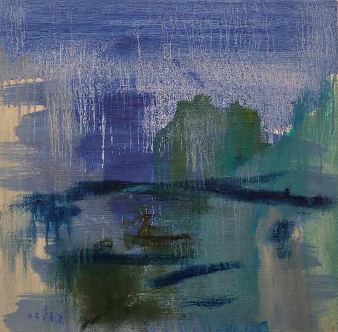 Rouhiainen Taru, Elämän virtauksessa 6, sekatekniikka kankaalle, 38×46 cm, 2025