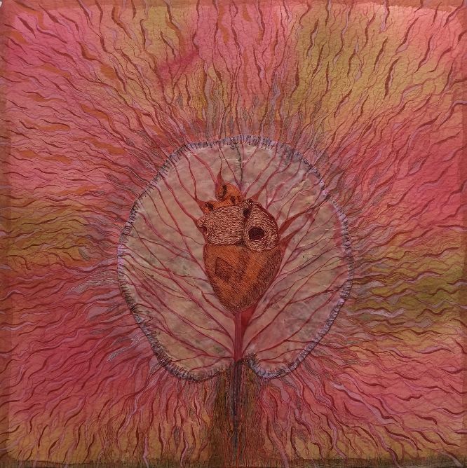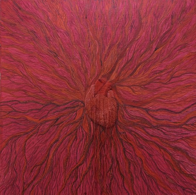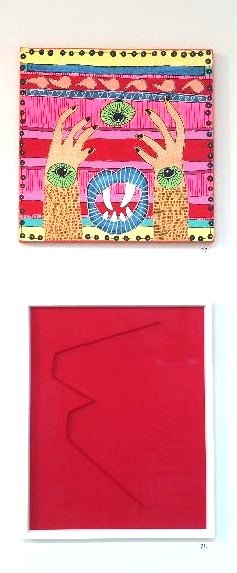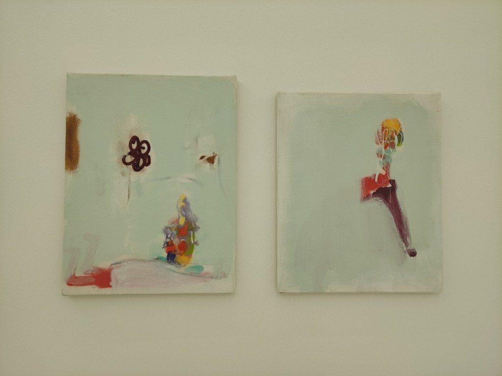 Ylhäällä Nora Ylipieti, Vulnerability, akryyli ja maalitussi kankaalle, 50×50 cm, 2024; Alhaalla Johanna Etelävirta, Rakkauden hammasratas, paperipiirros, 41×61 cm, 2025