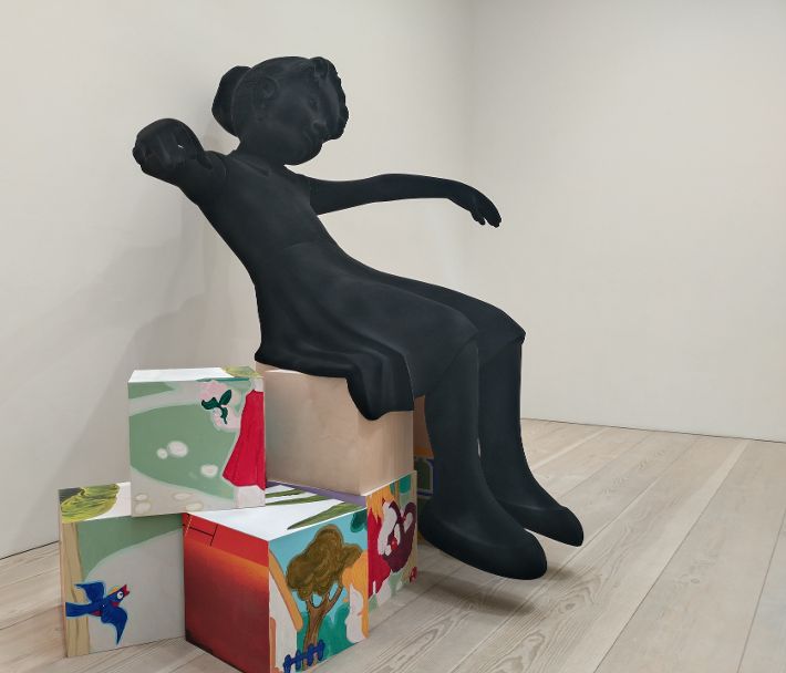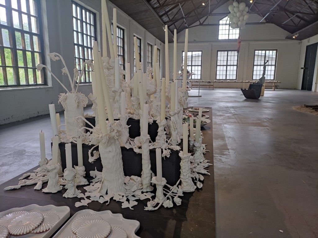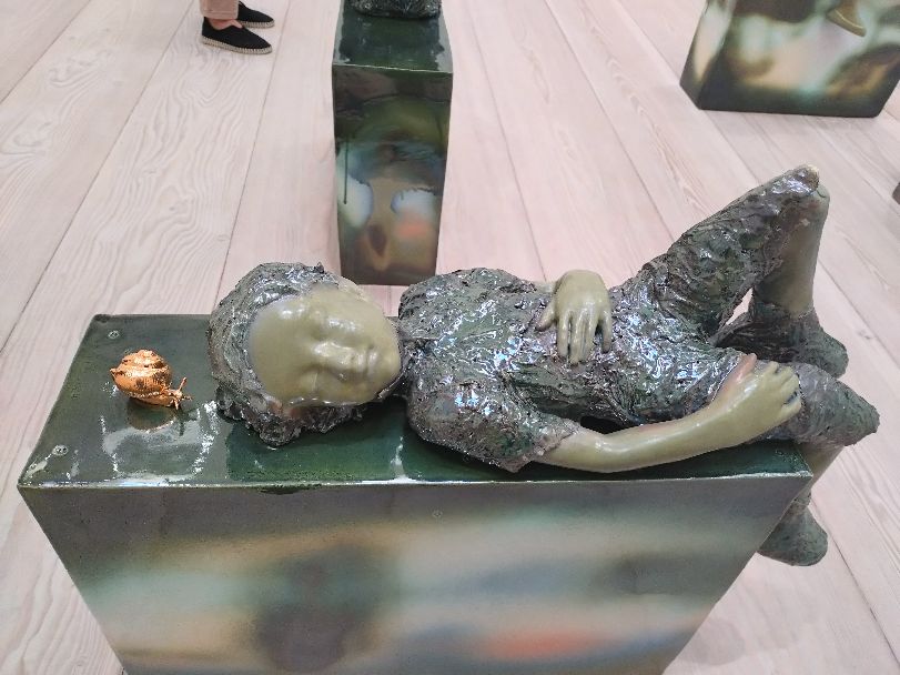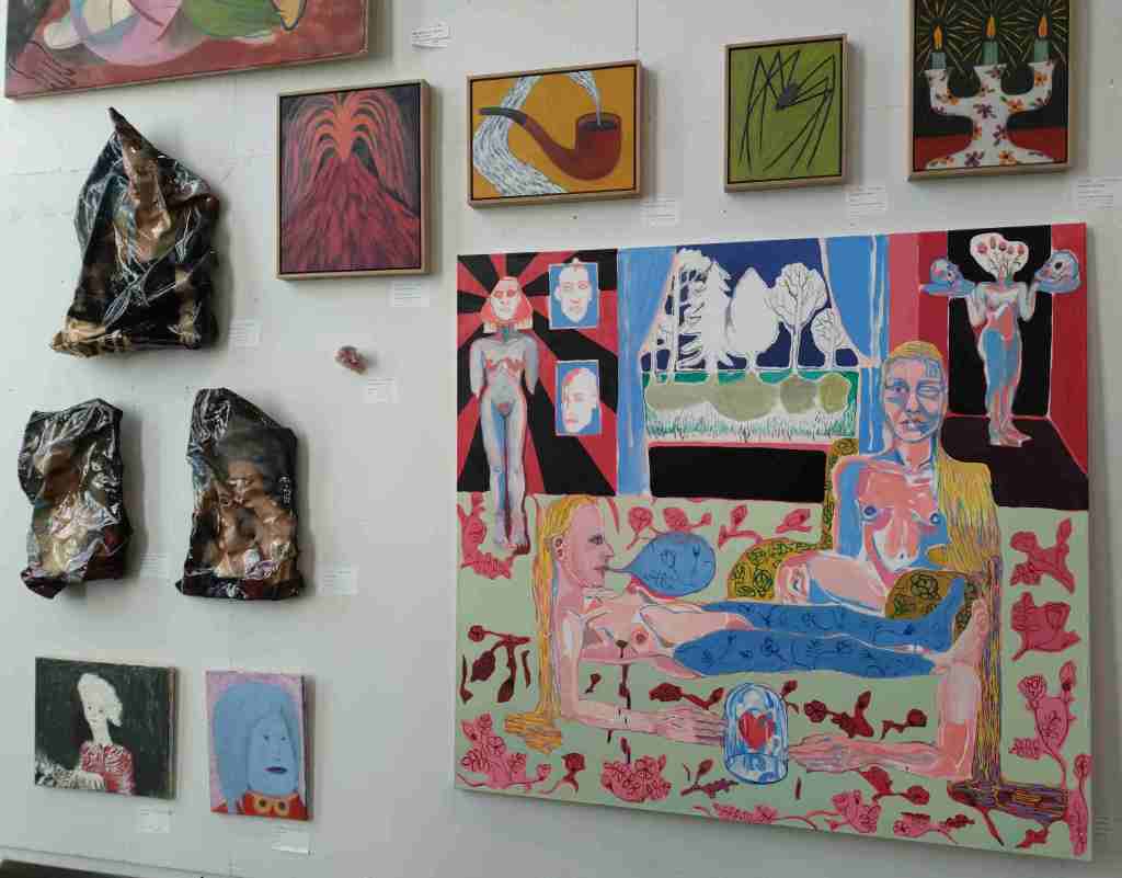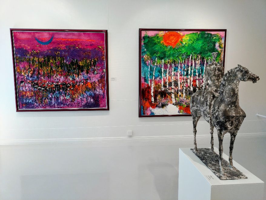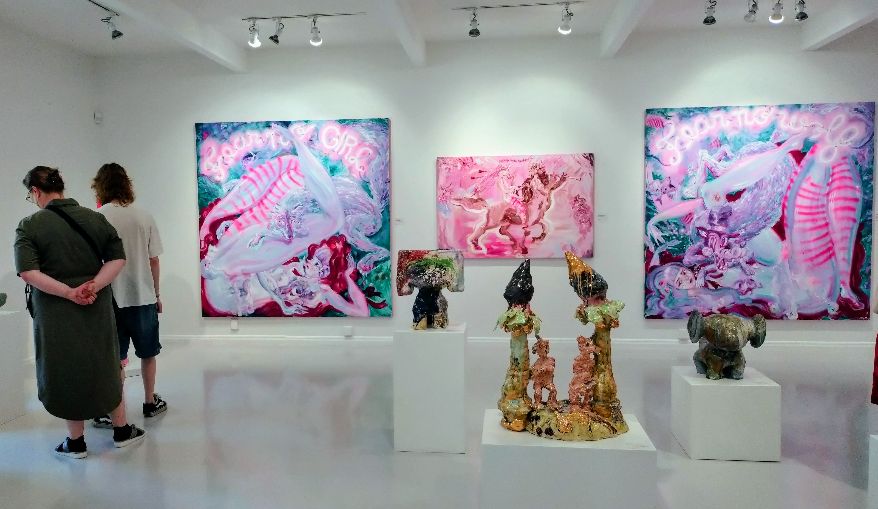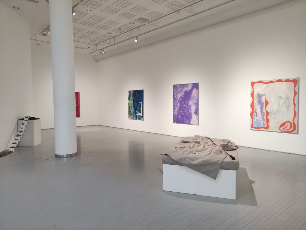 Katja Tukiainen yleisnäkymä, etualalle Jasmian Anoschkinin veistoksia, jotka jäävät vähän väritykityksen varjoon.