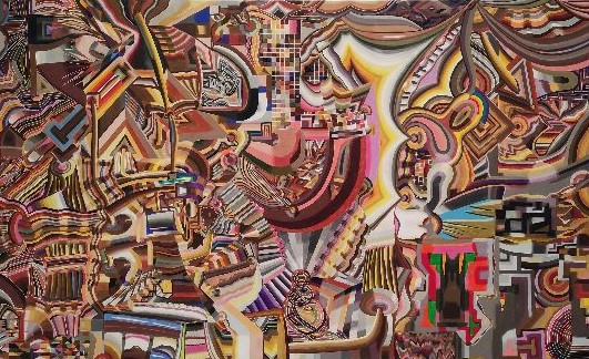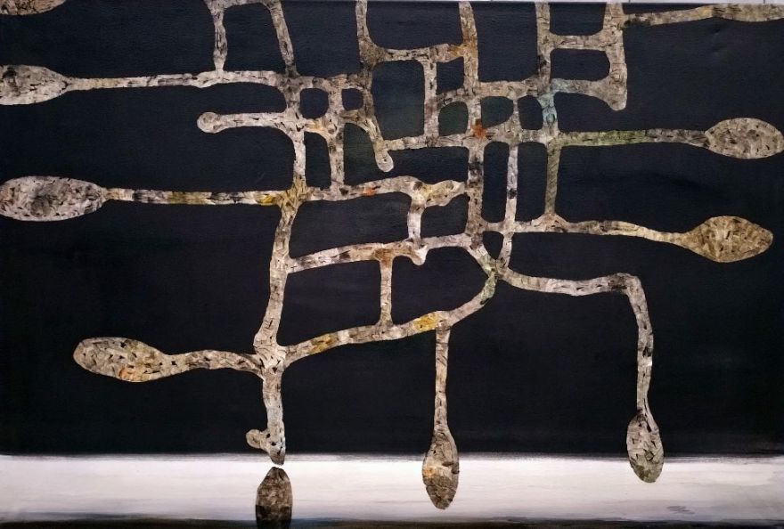 Peetu Liesinen, Floodgate 1, muste, akryyli ja kollaasi kankaalle, 150×180 cm, 2022