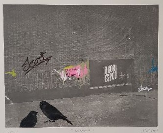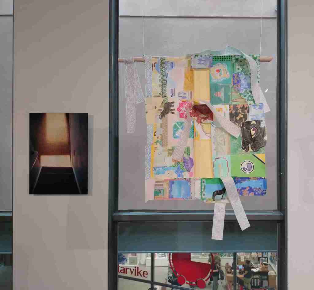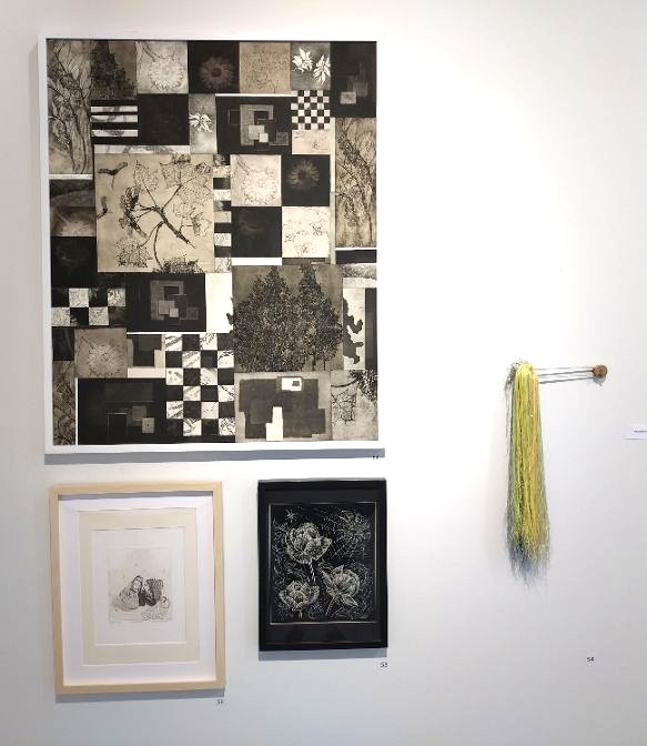 Ylhäältä alas oikealle: Taimi Lindström, Grafiikkakollaasi nro 7, grafiikan eri tekniikat, 85×105 cm, 2006; Elina Hartzell, Kesäkassit, pehmeä pohja, 42×52 cm, 1999; Kirsi Marja Moberg, Kolme/Tre, raapetekniikka, 43×32 cm, 2020; Maiju Ahlgren, Väliaikaista kaikki on vaan, 20x60x8 cm, 2025