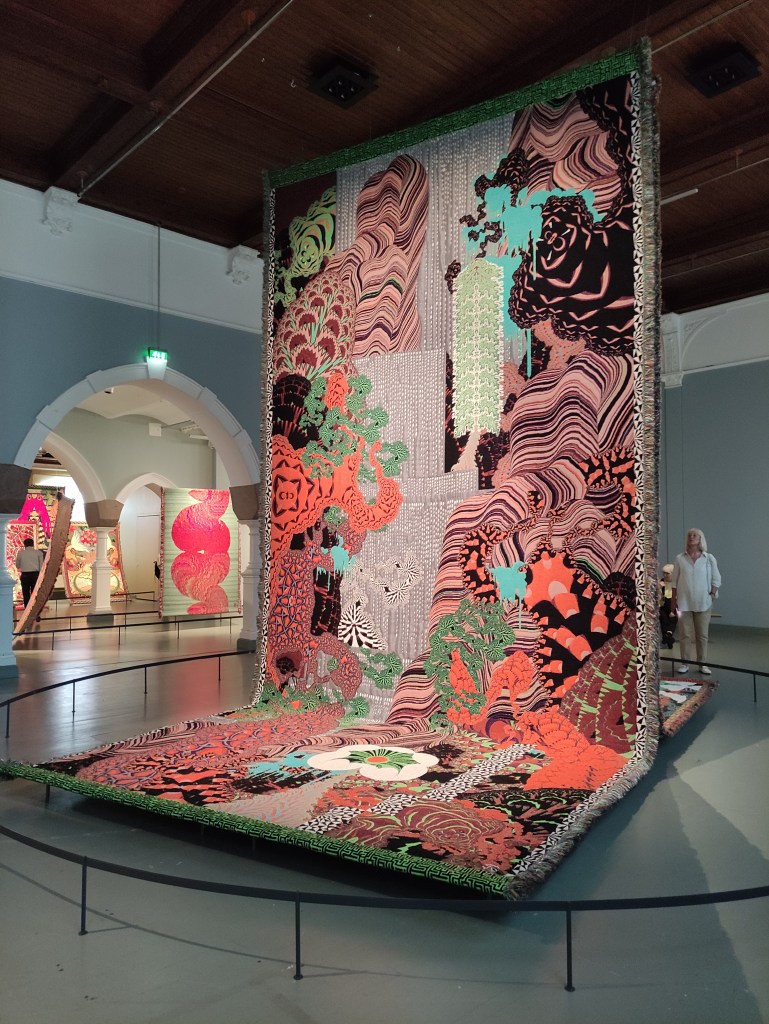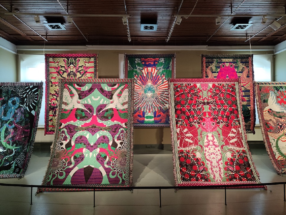 Toisessa päärakennuksen isossa salissa on Katja Tukiaisen vaalenanpunainen maailma täynnä ’tyttöenergiaa’. Tullessa huoneeseen ihan hätkähtää värien hehkua ja teosten viestivyyttä. Mielleyhtymiä tulee sarjakuvamaailmasta. Onpa Tukiainen muistellut Edelfeltin Kuningatar Blankaakin yhdessä työssä.