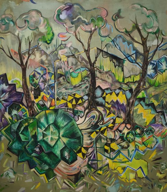 Jarmo Kukkonen, The web of Delosions, öljy kankaalle, 183×275 cm, 2023